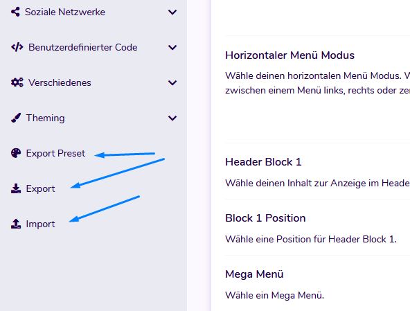 With the import/Export function you can export the settings from a template and import them into another template. This is useful for backing up your settings.