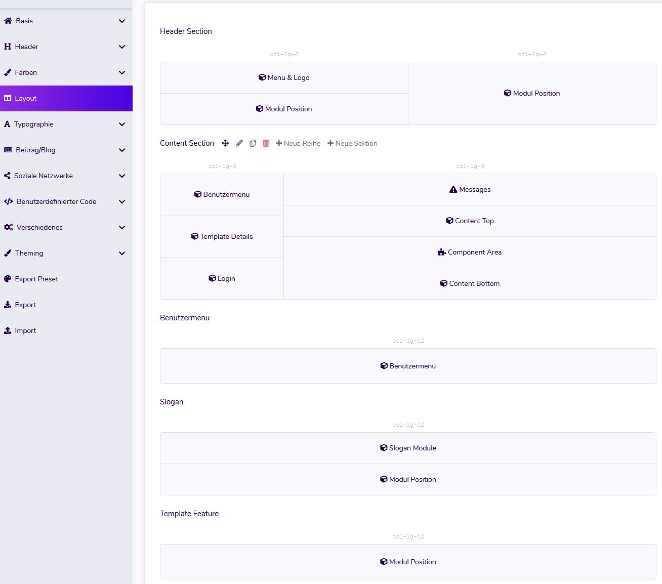 The Layout Manager is a powerful and effective tool that allows you to create flexible layouts in the drag and drop builder. With the drag & drop tool you can create and move any number of modules, sections and columns. You have the option of assigning images, videos and colors to all sections and modules
